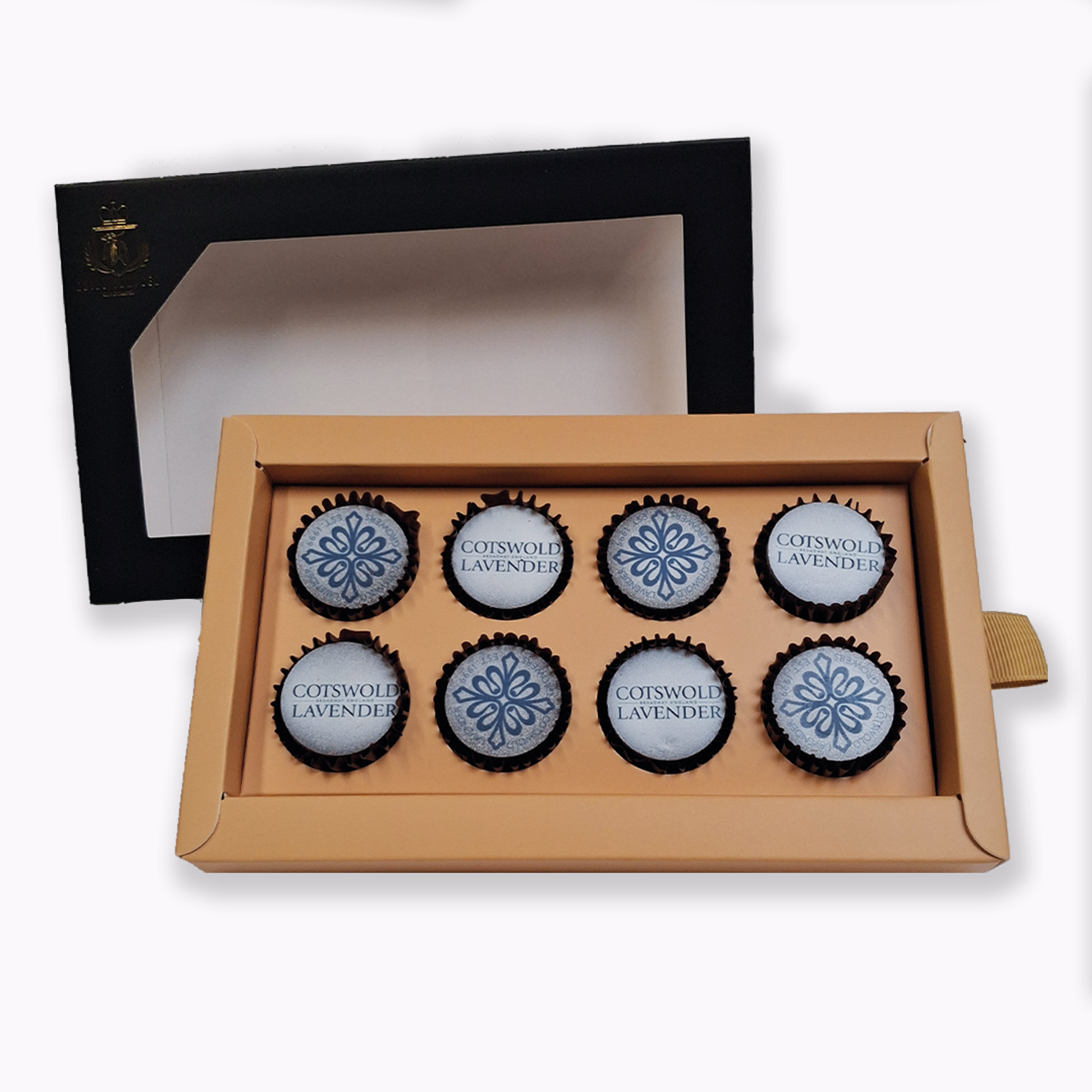 8 Handmade Cotswold Lavender branded chocolates with lavender flavoured ganache in a premium dark chocolate shell beautifully boxed.